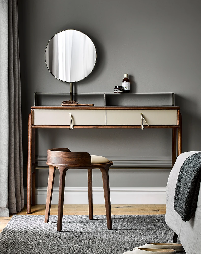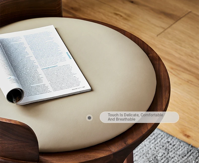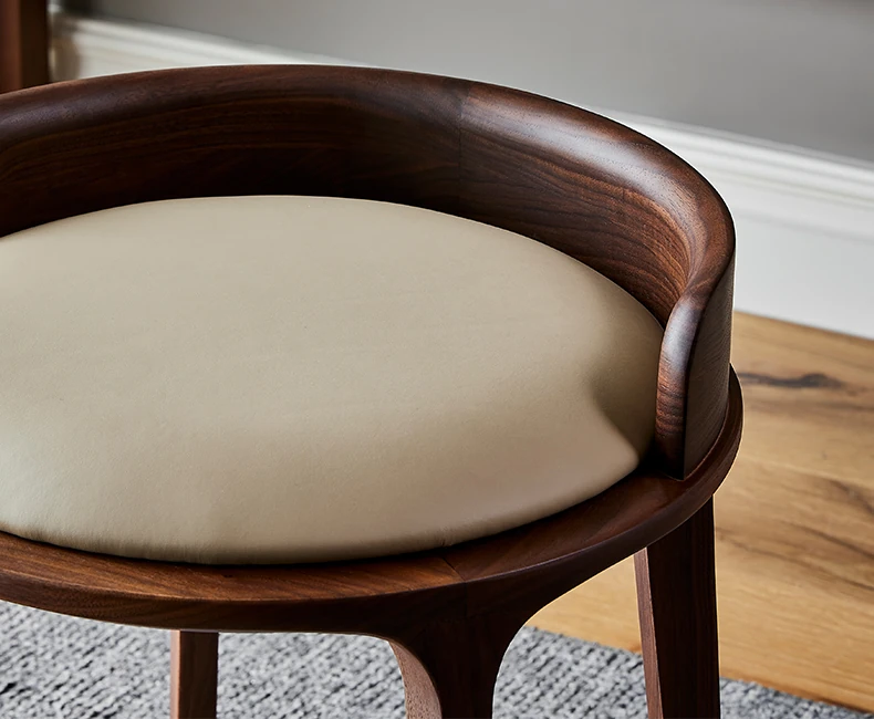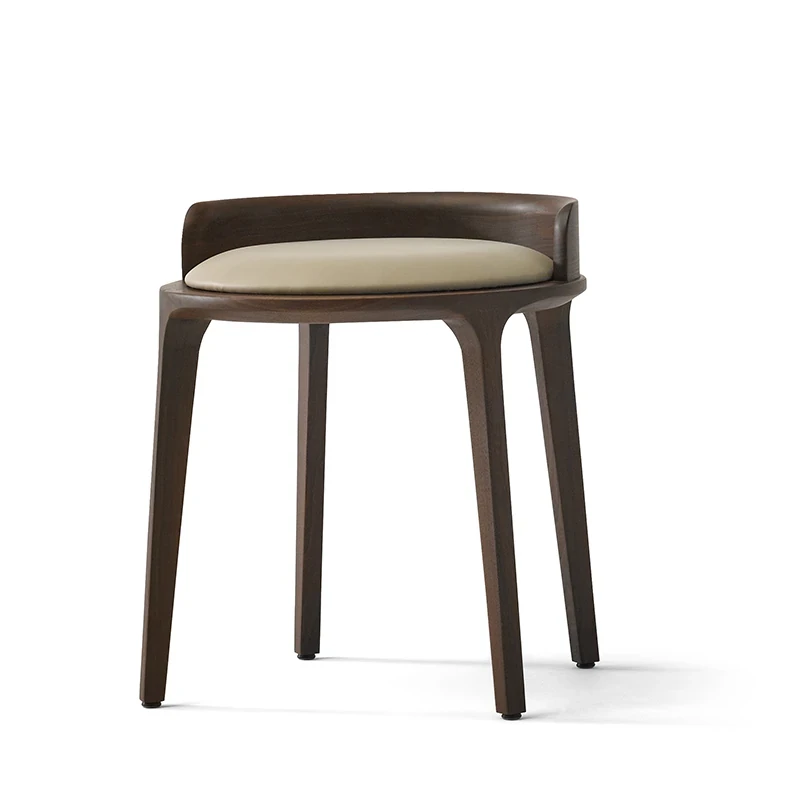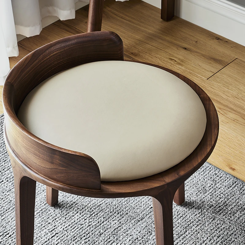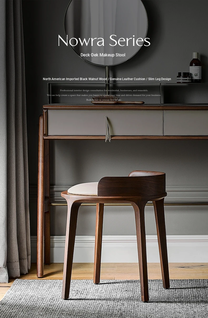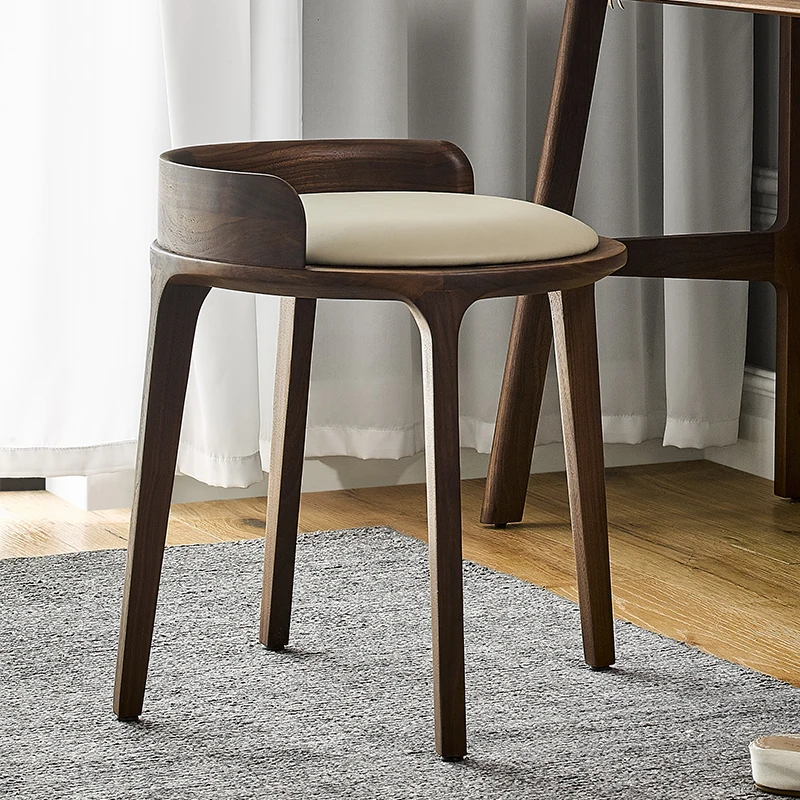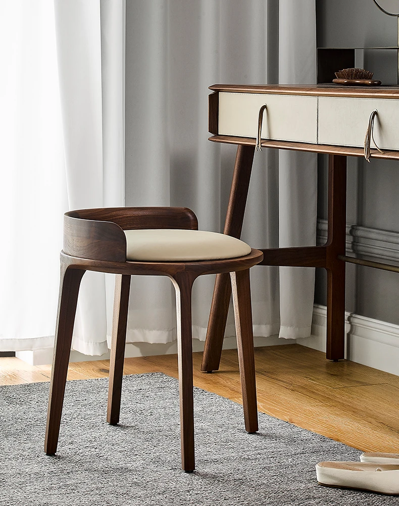 Kena Wabi-Sabi Style Black Walnut Solid Wood Vanity Stool with Genuine Leather Cushioned Backrest - Perfect for Your Bedroom Makeup Area