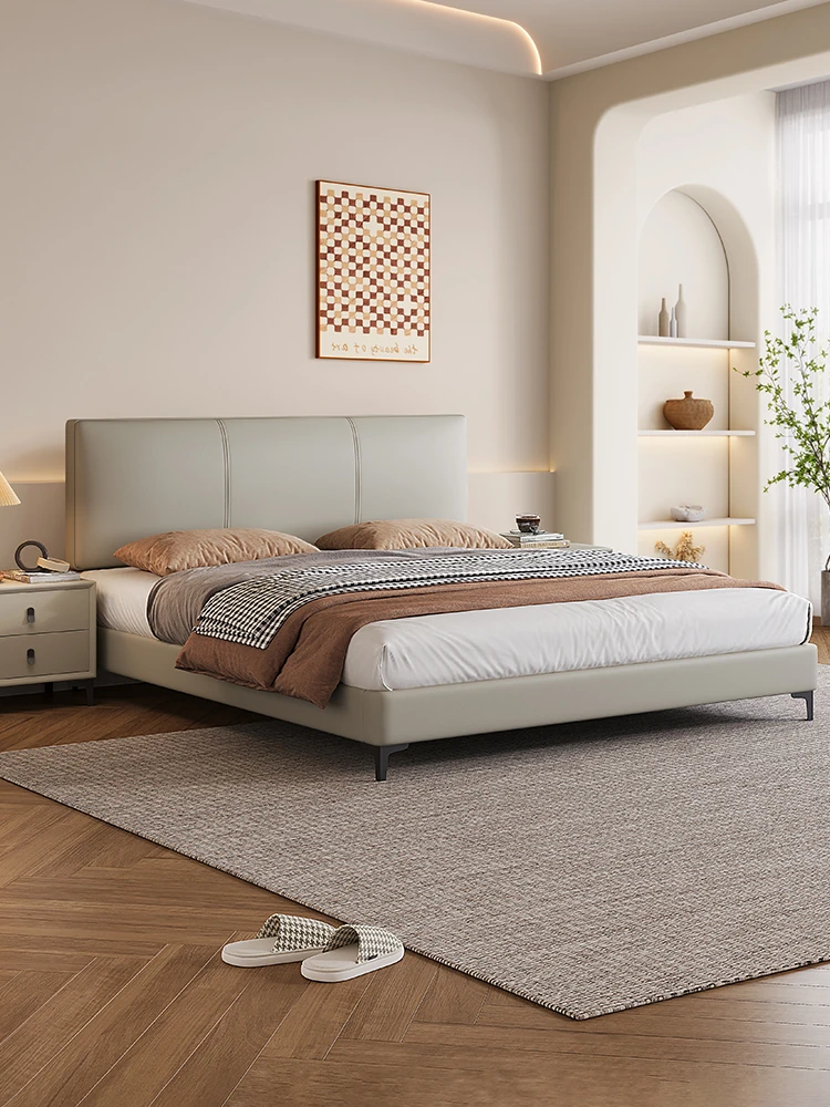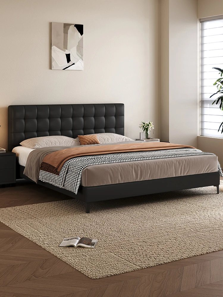 Luxury Italian Minimalist Real Leather Waffle Bed - Modern Double Master Bedroom Upholstered Soft Headboard King Size Bed