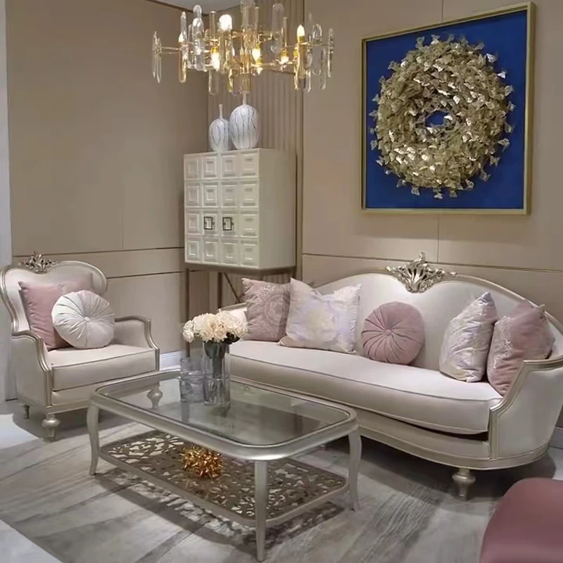 フレンチロイヤルスタイルのラグジュアリー無垢材ソファ - 高級感あふれるシンプルな3人掛けソファ、2024年新作!アメリカンスタイルのリビングにぴったりなトレンドアイテムです!