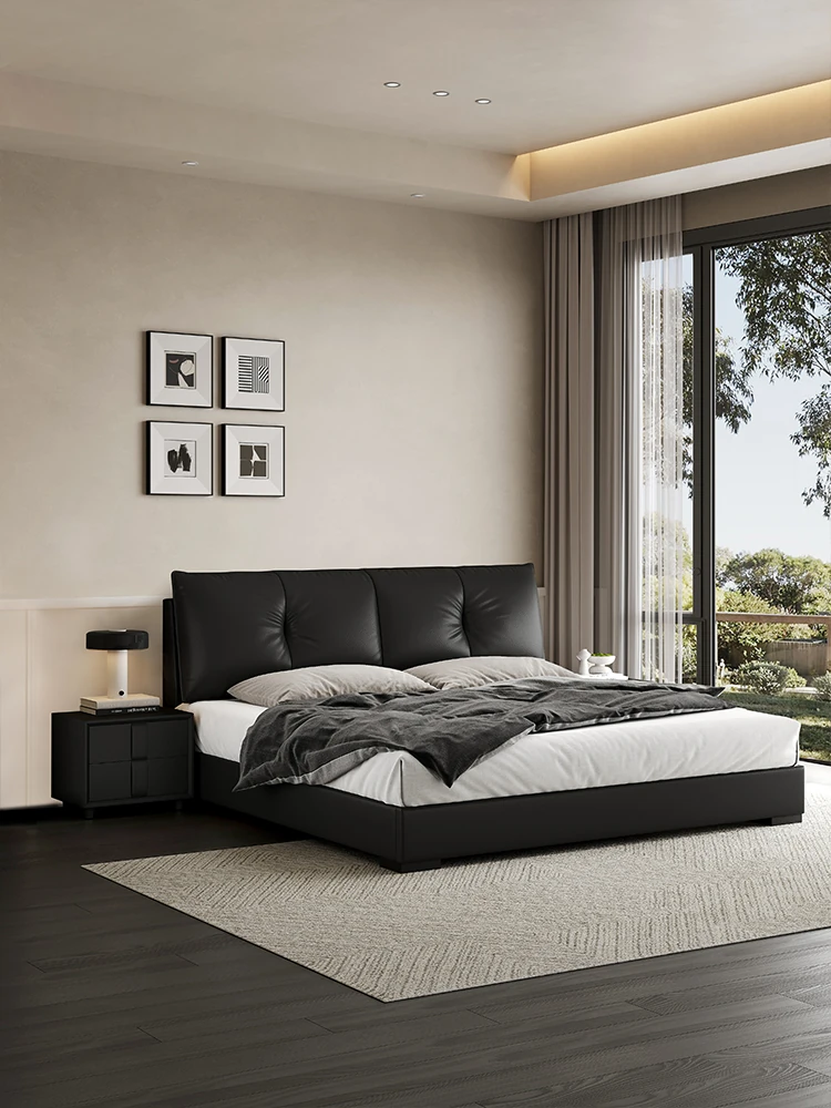 イタリアンミニマリズムの高級本革ダブルベッド - 2025年新作、スタイリッシュで収納力抜群のフロアベッド、主寝室にぴったりの洗練されたデザイン!