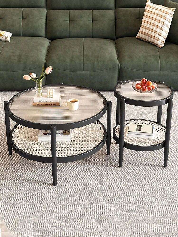 北欧風のラタン編みコーヒーテーブル - 小型住宅にぴったりの円形2段式、虹色のガラスを使用した和風シンプルデザイン。リビングルームに最適な組み合わせで、おしゃれな空間を演出します!
